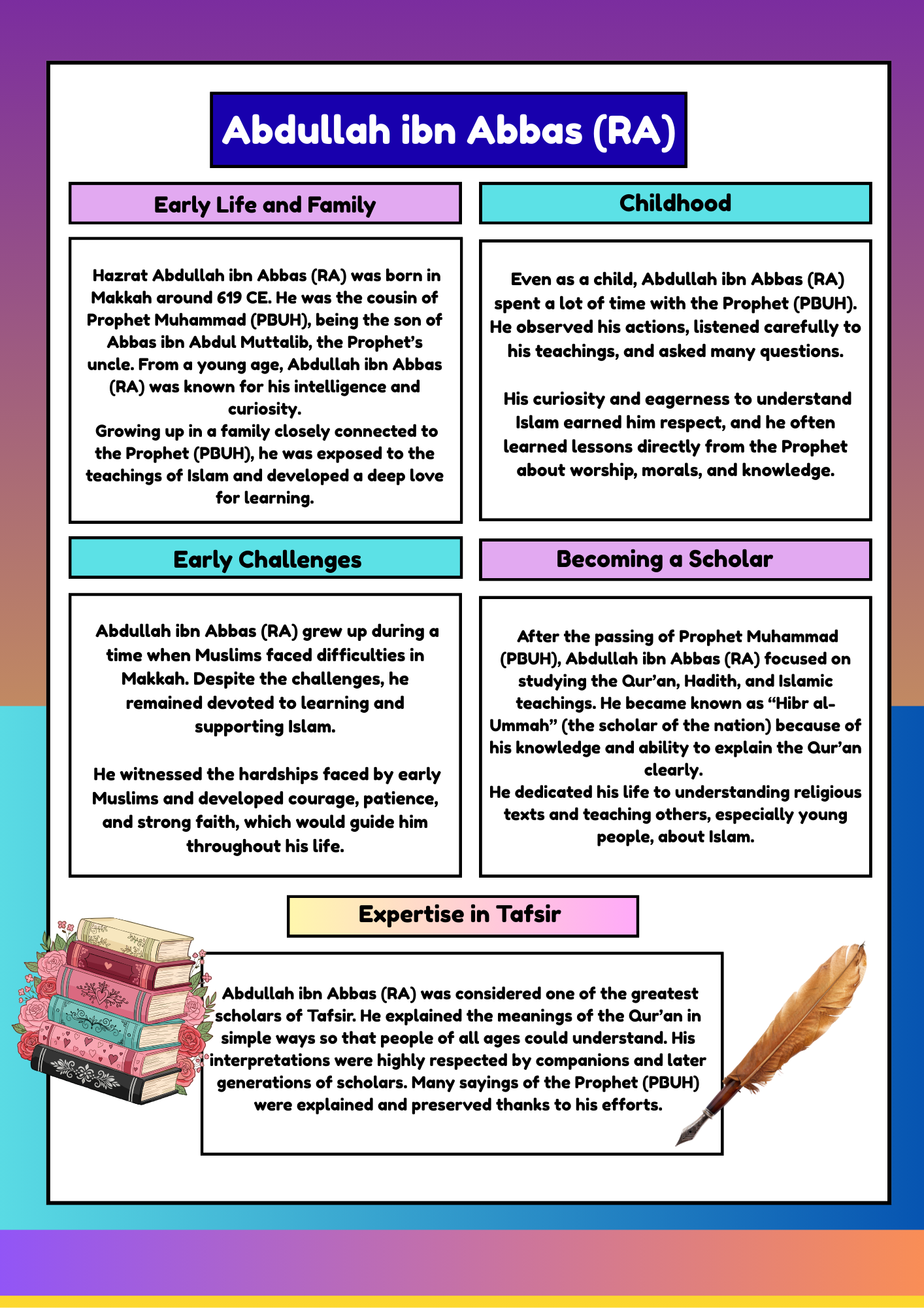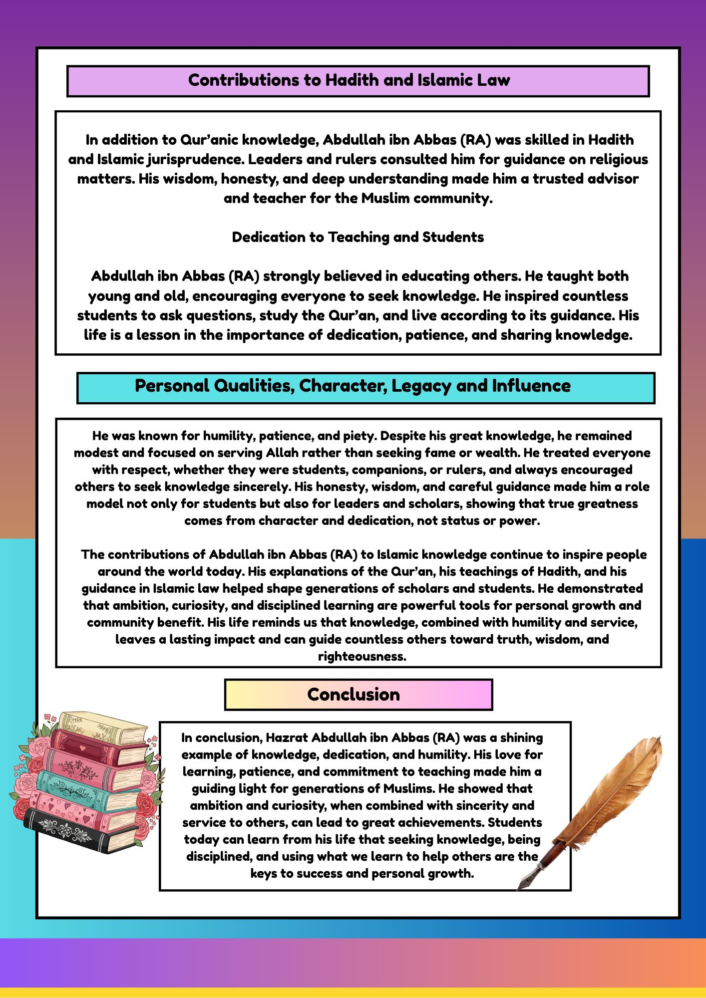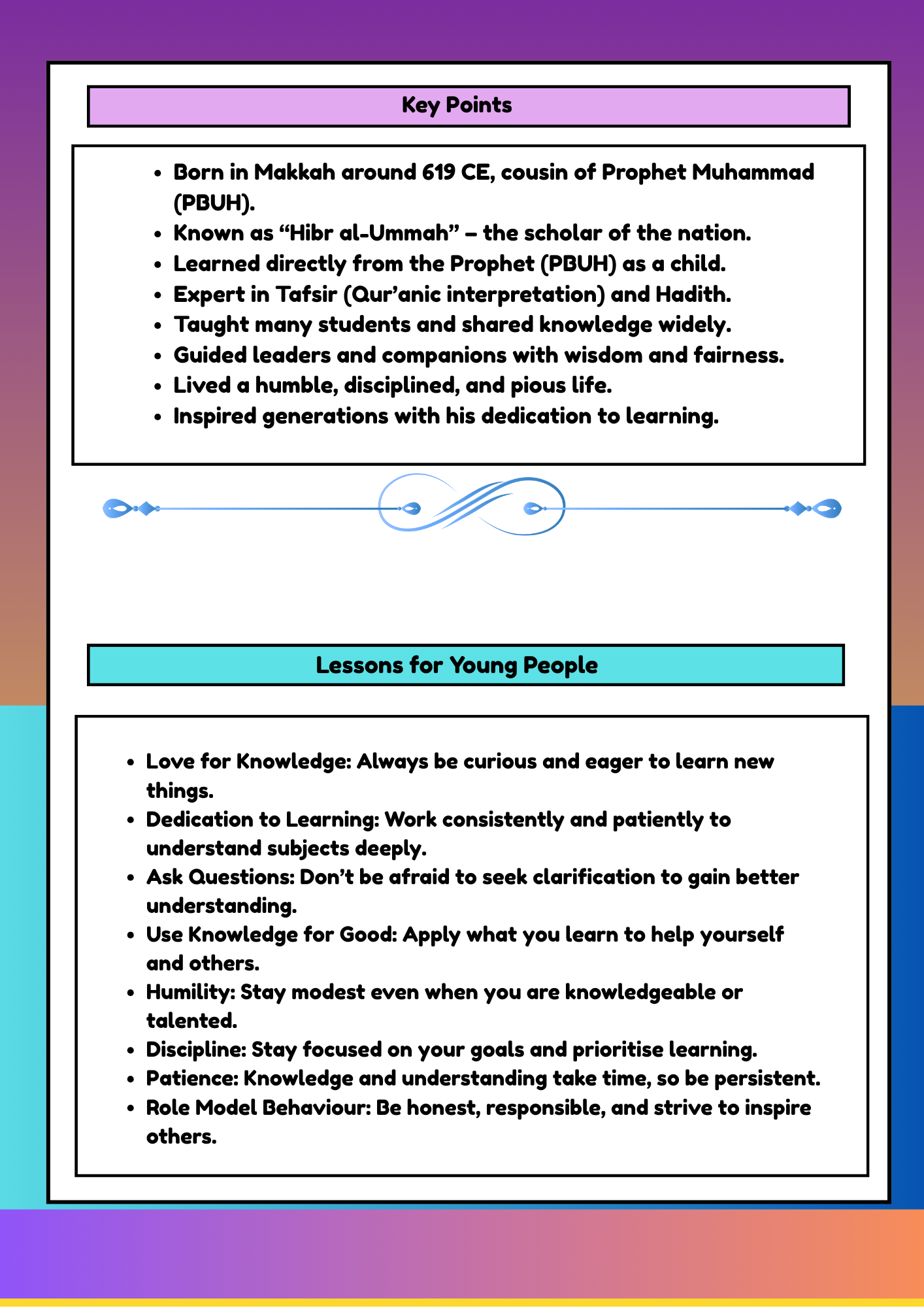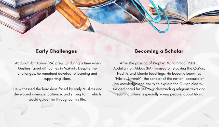This month, all students are focusing on importance of knowledge and dedication to learning, Hazrat Abdullah ibn Abbas رضي الله عنه life is a perfect example of how dedication to learning can inspire others to recognise that youth and status are secondary to the humble pursuit of knowledge.