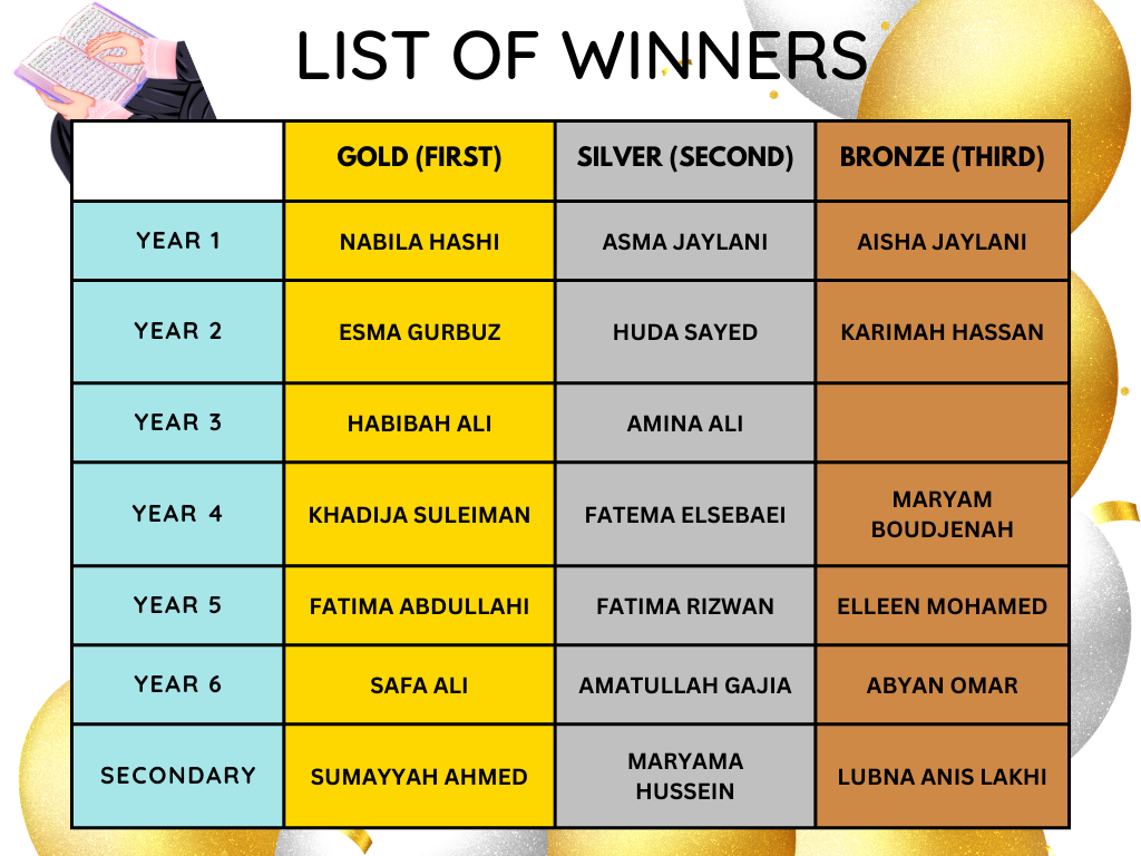 We recently hosted a Primary and Secondary Qur’an Competition that brought together students, parents, and teachers for a truly uplifting event. The competition consisted of two rounds, and the recitations throughout were beautiful, heartfelt, and of a very high standard. With such closely matched performances across both age groups, the competition was extremely tight, reflecting the dedication and hard work of all the participants.